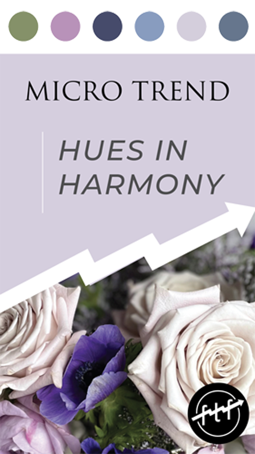 "Hues in Harmony" focuses on creating floral arrangements using monochromatic color schemes, highlighting the natural beauty and variety of flowers within the same color family. This approach aligns with modern design preferences for cohesion and simplicity.